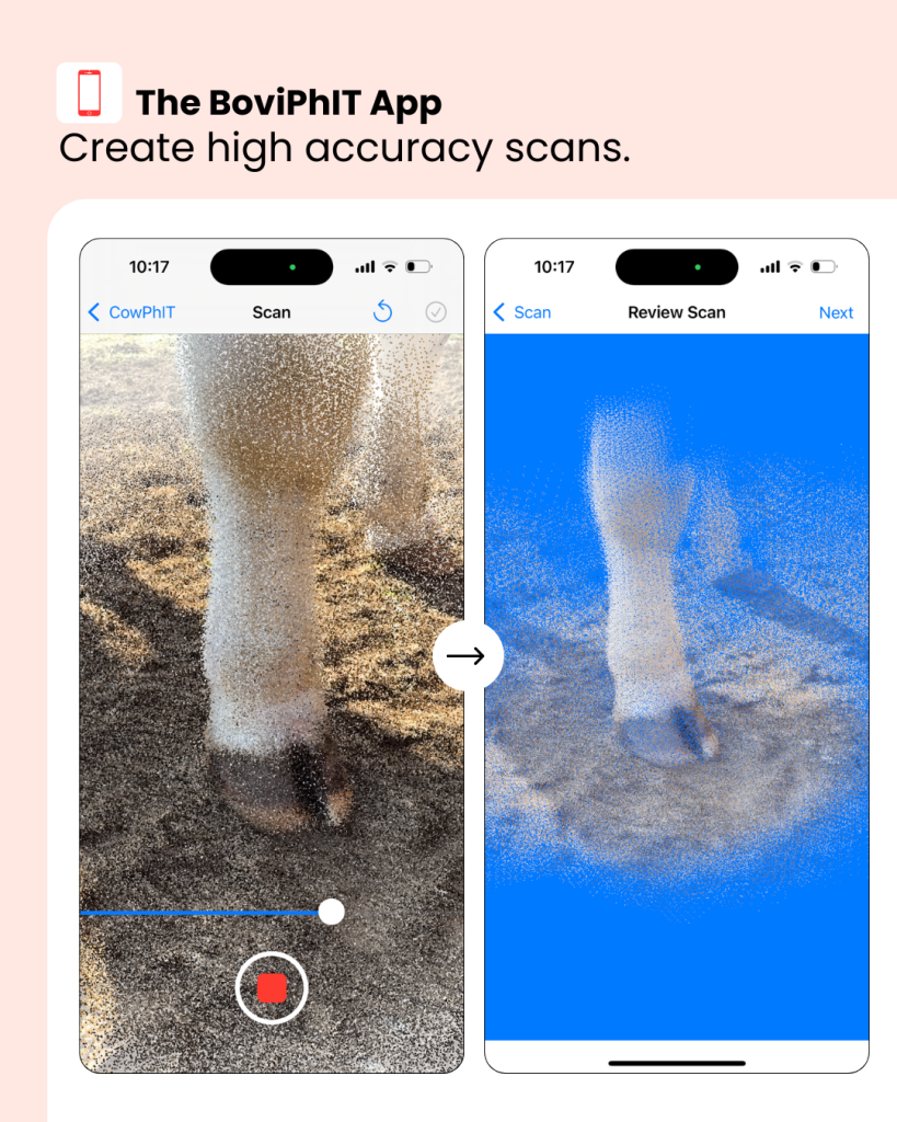 The BoviPhIT App aims to put all the wisdom of your old livestock judging coach into your back pocket. Our iOS app allows you to use the cameras already on your iPhone (Pro/Max models 12+) to create a high accuracy 3D scan of key structural features of your cow. Get real time feedback image capture as you scan and scan any body part you fancy – your scan is ultimately only limited by how long your cow will stand still.
